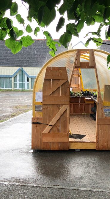 La première étape du projet est la construction d’une serre pédagogique. Cet aménagement est le point de départ de la végétalisation de la cour. En octobre et durant toute l’année ccolaire, les enfants y plantent les semis qui peuplerons la cour.